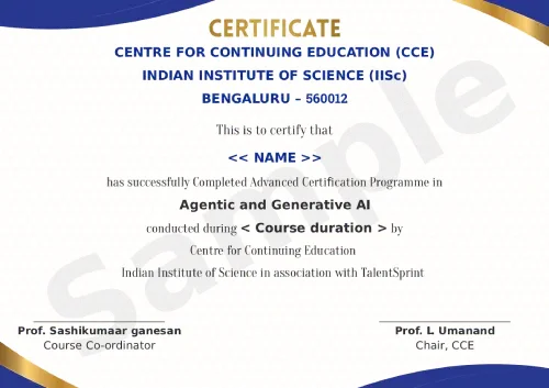 - CCE-IISc Advantage: Master the Agentic and Generative AI concept in practice through this AI course designed and delivered by IISc faculty members. Earn the prestigious certification from CCE at IISc, a valuable credential that sets you apart in the competitive industry.